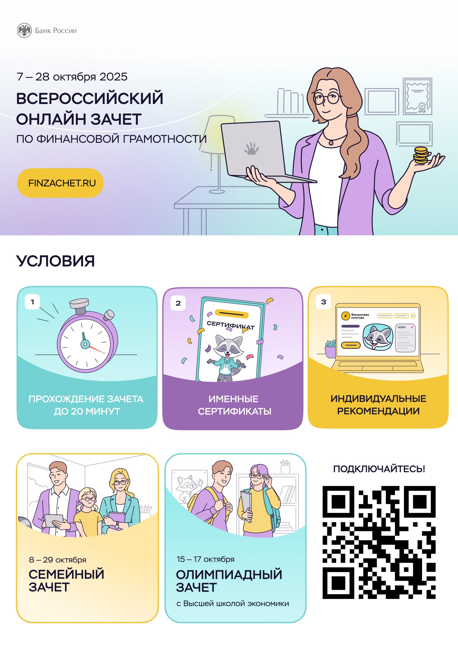 Прохождение личного зачета займет всего до 20 минут, олимпиадного – до 40 минут, семейного – до 1 часа. Подробности и регистрация – на сайте проекта https://finzachet.ru.